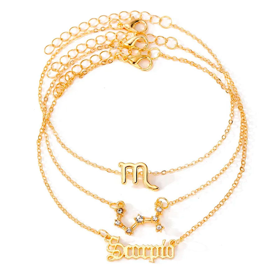Preciosa tobillera de tres cadenas en las que tienes tu signo en diagrama, la constelación que la representa y el nombre de tu Signo del Zodíaco, una preciosa creación que podrás lucir en tus tobillos o regalar a esa persona querida.